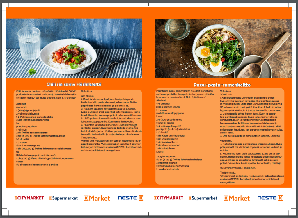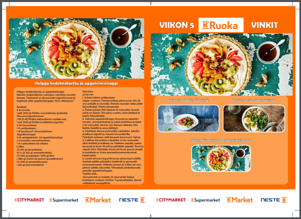 Meidän piti suunnitella K-ruoka vinkit lehti koulussa. Saimme valmiiksi käytettäväksi oikeat fontit ja kuvat, joten työ helpottui huimasti.