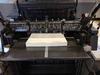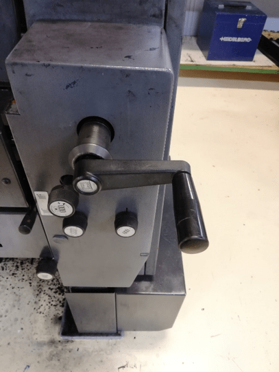 Sitten paperit laitettiin koneen hissiin ensin säätäen hissin korkeutta riippuen paperin määrästä ja sen jälkeen säätäen sivuttaiset arkinvastimet sopivalle leveydelle siten, että pöydän asteikkoluvut ovat paperien molemmilta reunoilta samalla luvulla ja niin, että paperiarkit mahtuvat hyvin niiden väliin, mutta ei liian kireälle, jotta paperit mahtuvat olemaan suorassa ja liikkumaan vapaasti painettaessa.