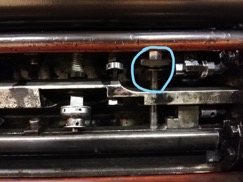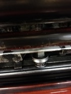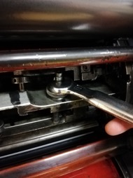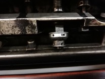 Sitten avataan takimmainen kiristyskisko ja painetaan sykäyskäyttö-nappia ja pyöritetään sylinterikanaalia siihen asti, kunnes päästään irrottamaan vanhan painolevyn pää etummaisesta kiristyskiskosta.