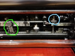 Sitten kun nämä edellä mainitut ovat kunnossa, tarkistetaan painokoneen takaosa eli säädetään takapuolella olevat sivuttaiset arkinvastimet ja takavastimet niin, että arkki mahtuu putoamaan hissille. Hissi säädetään sopivalle korkeudelle riippuen painomäärästä. Jos painaa vähän hissin voi lukita ylimmälle tasolle, mutta paljon painettaessa hissin voi antaa vapaasti liikkua alas päin sitä mukaa kuin kone päättää sille olevan tarvetta. Takana oleva luukku tulee laittaa kiinni ennen kuin laittaa paperin kulkemaan, jotta paperit eivät tule takaosasta ulos.
