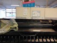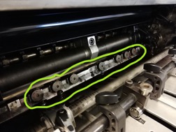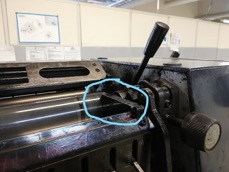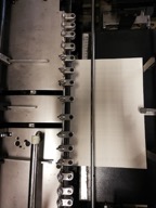 Sitten säädettiin sivustin siten, että koneen vasemmanpuolinen sivustin on samalla kohdalla arkkien vasemman reunan kanssa niin, että sivustin työntää arkkeja hieman n. 3 mm oikealle niiden kulkiessa sivustimen ohi.