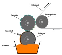 Painosylinterissä olevat laatat levittävät tasaisen värikerroksen, joka siirtyy painettavalle materiaalille puristuksen voimalla ja sitä pystytään säätämään puristussylinterin avulla.