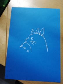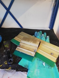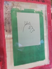 Kun painolevyn painokangas oli kuivunut, se otettiin ulos uunista ja teipattiin kalvo kiinni painolevyn kankaan takapuolelle mahdollisimman keskelle, jotta painaminen olisi sitten sen koittaessa helppoa.