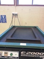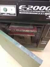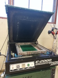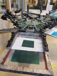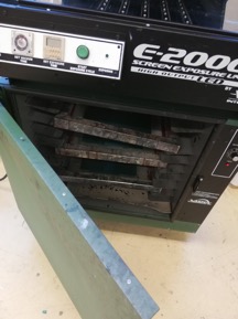 Tämän jälkeen painolevy otettiin pois uunista ja kiinnitettiin silkkipidikkeeseen ja säädettiin sopivasti niin, että painokuva osuu mahdollisimman suorassa painoalustalle.